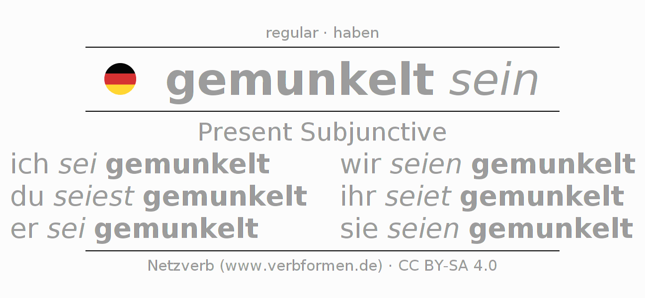 The conjugation of munkeln in Subjunctive Present Form of possibility Statal Passive is ich sei gemunkelt, du seiest gemunkelt, er sei gemunkelt, wir seien gemunkelt, ihr seiet gemunkelt, sie seien gemunkelt.The conjugation corresponds to certain grammatical rules. Likewise the requirements for the conjugation of the simple verb forms of munkeln in Present Subjunctive. Comments ☆
