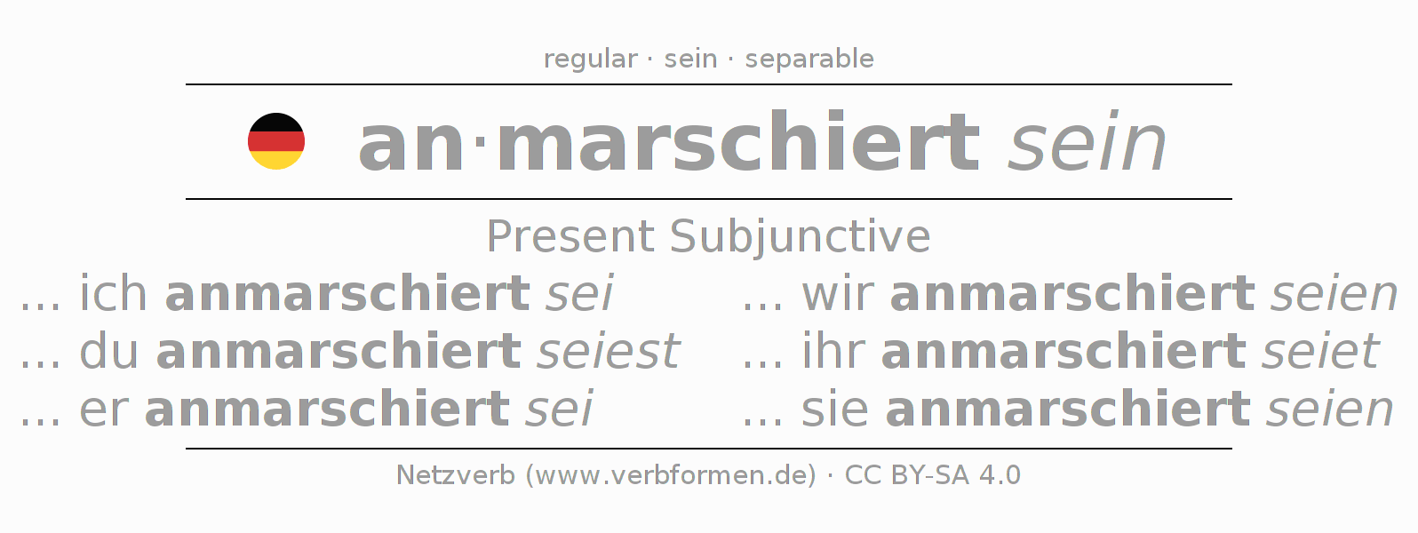 The verb anmarschieren fully conjugated in all persons and numbers in the Subjunctive Present