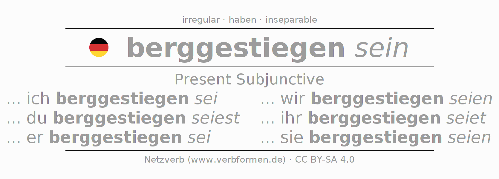 The verb bergsteigen (hat) fully conjugated in all persons and numbers in the Subjunctive Present