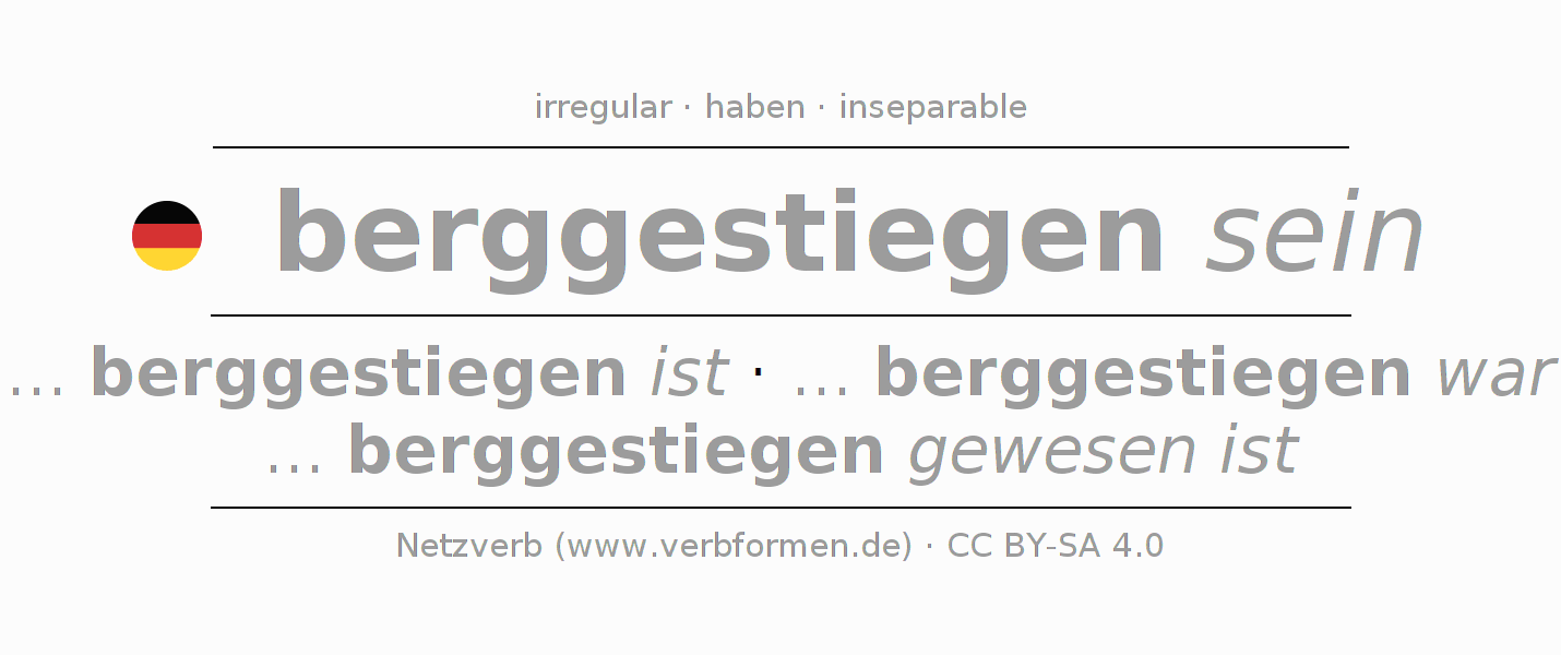 The conjugation of bergsteigen in Subjunctive Present Form of possibility Statal Passive is ... ich berggestiegen sei, ... du berggestiegen seiest, ... er berggestiegen sei, ... wir berggestiegen seien, ... ihr berggestiegen seiet, ... sie berggestiegen seien.The conjugation corresponds to certain grammatical rules. Likewise the requirements for the conjugation of the simple verb forms of bergsteigen in Present Subjunctive. Comments ☆