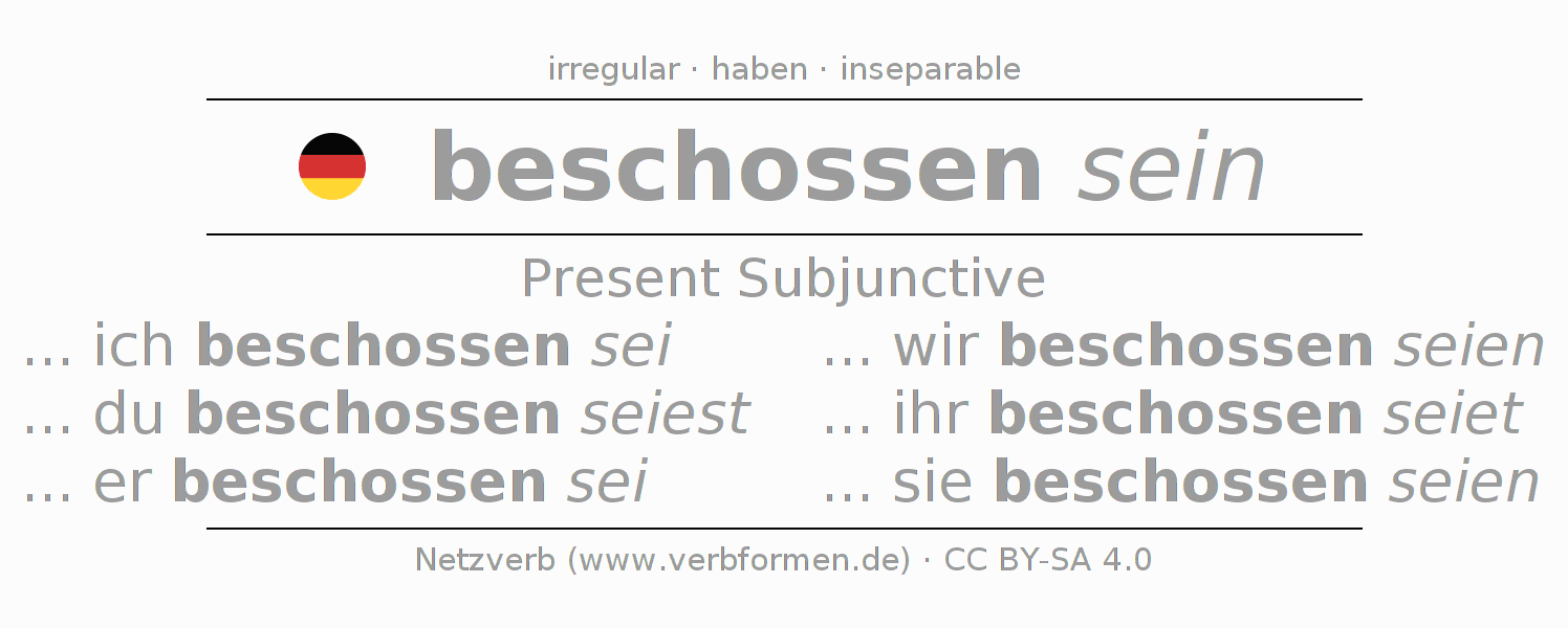 The verb beschießen fully conjugated in all persons and numbers in the Subjunctive Present