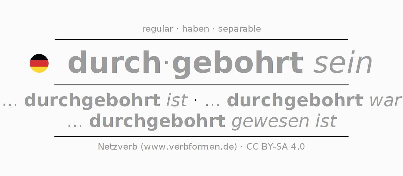 The conjugation of durchbohren in Subjunctive Present Form of possibility Statal Passive is ... ich durchgebohrt sei, ... du durchgebohrt seiest, ... er durchgebohrt sei, ... wir durchgebohrt seien, ... ihr durchgebohrt seiet, ... sie durchgebohrt seien.The conjugation corresponds to certain grammatical rules. Likewise the requirements for the conjugation of the simple verb forms of durchbohren in Present Subjunctive. Comments ☆
