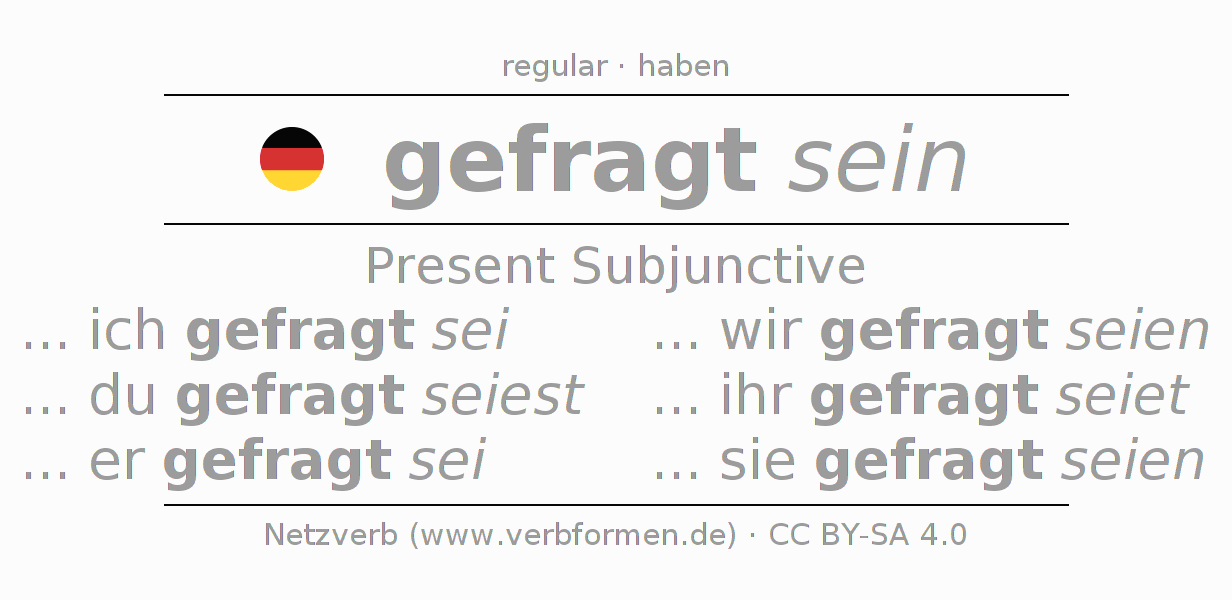 The conjugation of fragen in Subjunctive Present Form of possibility Statal Passive is ... ich gefragt sei, ... du gefragt seiest, ... er gefragt sei, ... wir gefragt seien, ... ihr gefragt seiet, ... sie gefragt seien.The conjugation corresponds to certain grammatical rules. Likewise the requirements for the conjugation of the simple verb forms of fragen in Present Subjunctive. Comments ☆