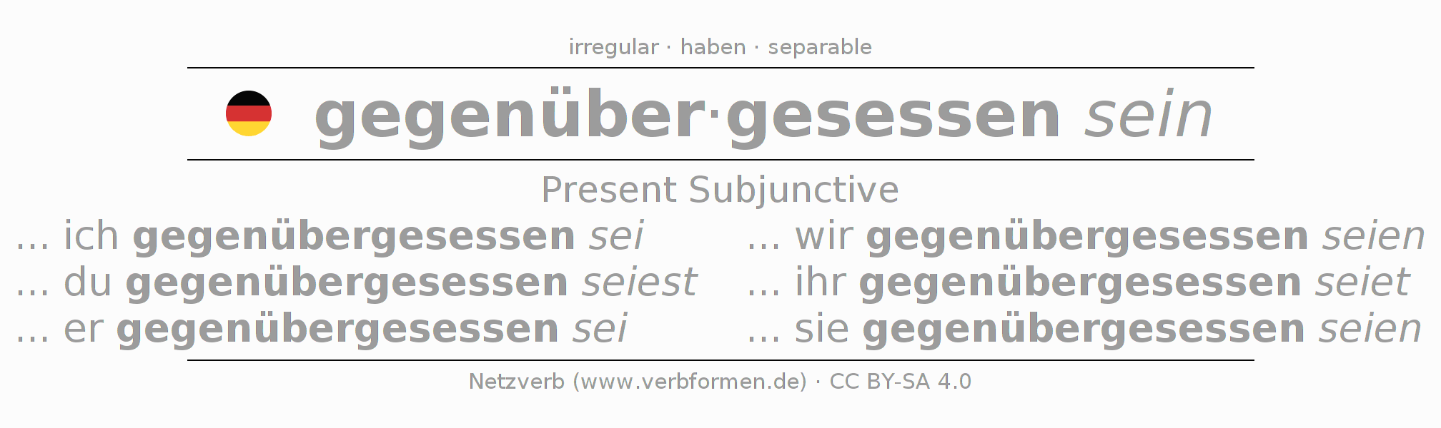 The verb gegenübersitzen (hat) fully conjugated in all persons and numbers in the Subjunctive Present