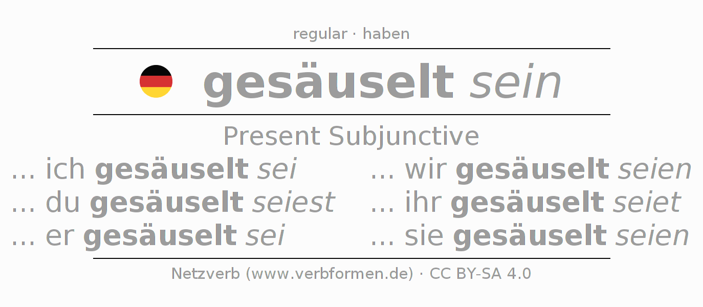 The conjugation of säuseln in Subjunctive Present Form of possibility Statal Passive is ... ich gesäuselt sei, ... du gesäuselt seiest, ... er gesäuselt sei, ... wir gesäuselt seien, ... ihr gesäuselt seiet, ... sie gesäuselt seien.The conjugation corresponds to certain grammatical rules. Likewise the requirements for the conjugation of the simple verb forms of säuseln in Present Subjunctive. Comments ☆