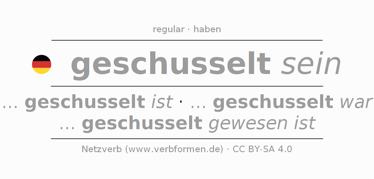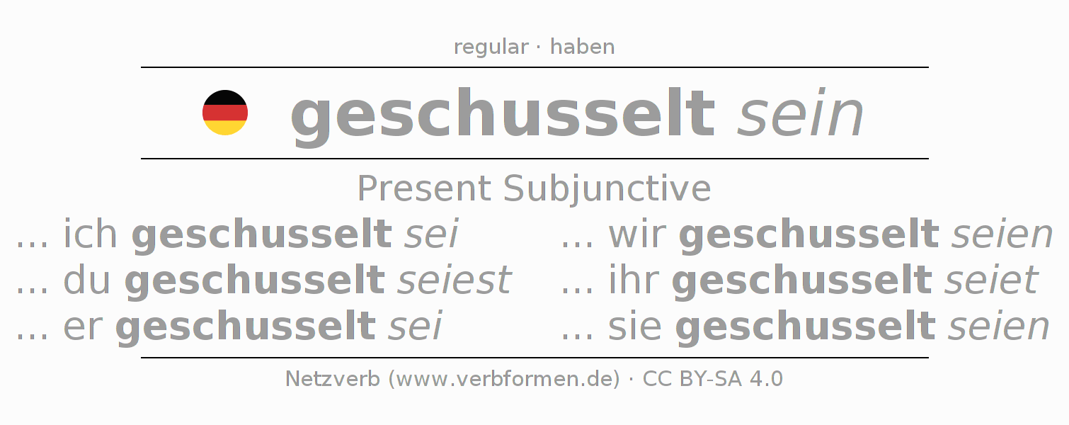 The conjugation of schusseln in Subjunctive Present Form of possibility Statal Passive is ... ich geschusselt sei, ... du geschusselt seiest, ... er geschusselt sei, ... wir geschusselt seien, ... ihr geschusselt seiet, ... sie geschusselt seien.The conjugation corresponds to certain grammatical rules. Likewise the requirements for the conjugation of the simple verb forms of schusseln in Present Subjunctive. Comments ☆