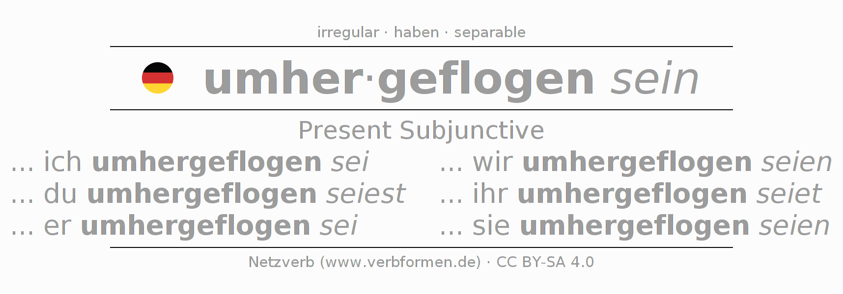 The verb umherfliegen (hat) fully conjugated in all persons and numbers in the Subjunctive Present