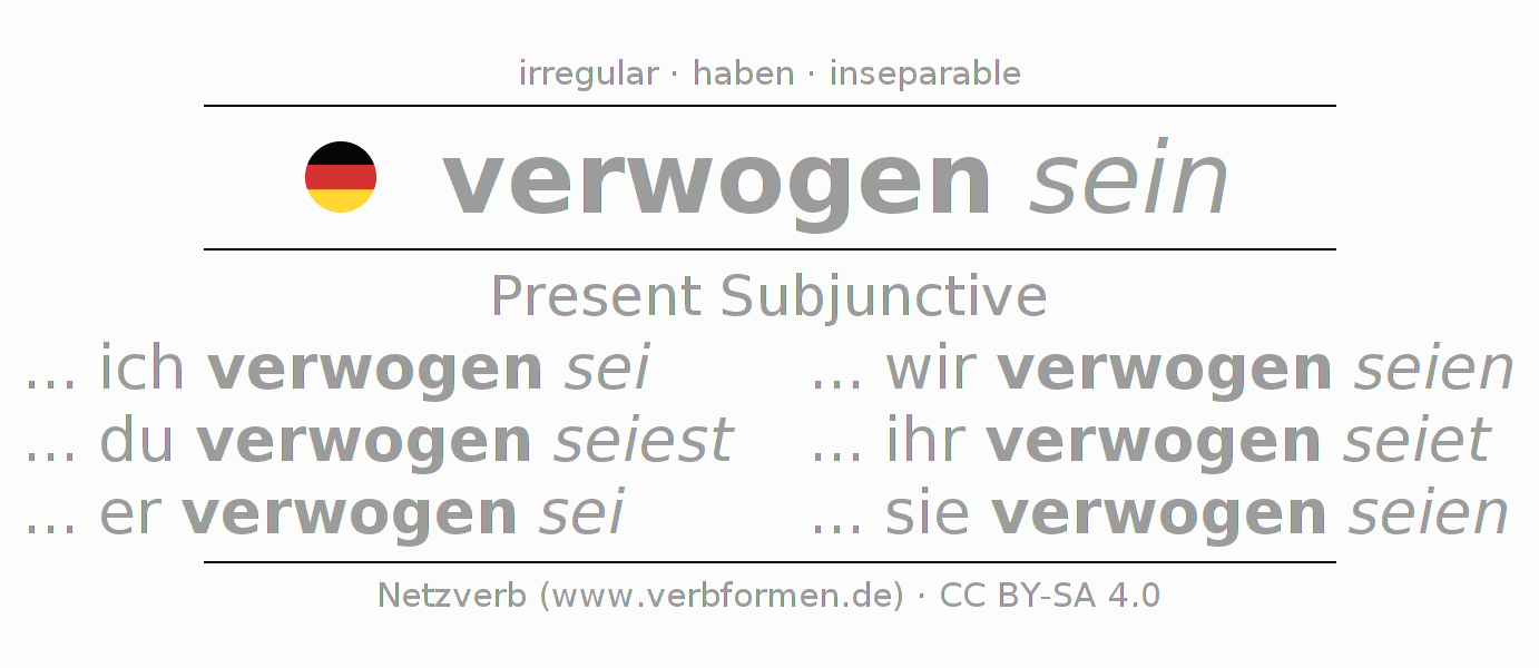 The conjugation of verwiegen in Subjunctive Present Form of possibility Statal Passive is ... ich verwogen sei, ... du verwogen seiest, ... er verwogen sei, ... wir verwogen seien, ... ihr verwogen seiet, ... sie verwogen seien.The conjugation corresponds to certain grammatical rules. Likewise the requirements for the conjugation of the simple verb forms of verwiegen in Present Subjunctive. Comments ☆