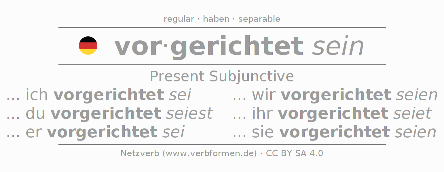 The conjugation of vorrichten in Subjunctive Present Form of possibility Statal Passive is ... ich vorgerichtet sei, ... du vorgerichtet seiest, ... er vorgerichtet sei, ... wir vorgerichtet seien, ... ihr vorgerichtet seiet, ... sie vorgerichtet seien.The conjugation corresponds to certain grammatical rules. Likewise the requirements for the conjugation of the simple verb forms of vorrichten in Present Subjunctive. Comments ☆