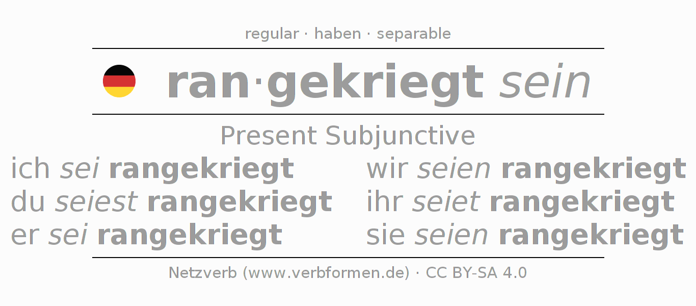 The conjugation of rankriegen in Subjunctive Present Form of possibility Statal Passive is ich sei rangekriegt, du seiest rangekriegt, er sei rangekriegt, wir seien rangekriegt, ihr seiet rangekriegt, sie seien rangekriegt.The conjugation corresponds to certain grammatical rules. Likewise the requirements for the conjugation of the simple verb forms of rankriegen in Present Subjunctive. Comments ☆