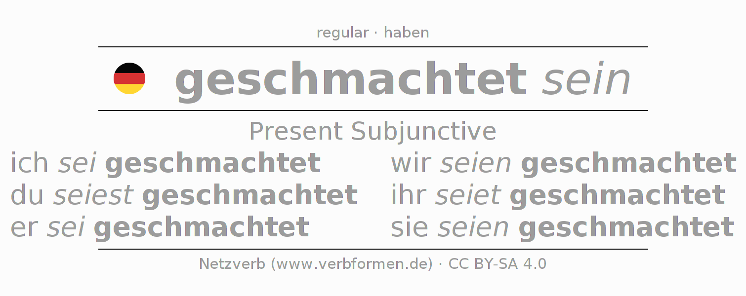 The conjugation of schmachten in Subjunctive Present Form of possibility Statal Passive is ich sei geschmachtet, du seiest geschmachtet, er sei geschmachtet, wir seien geschmachtet, ihr seiet geschmachtet, sie seien geschmachtet.The conjugation corresponds to certain grammatical rules. Likewise the requirements for the conjugation of the simple verb forms of schmachten in Present Subjunctive. Comments ☆