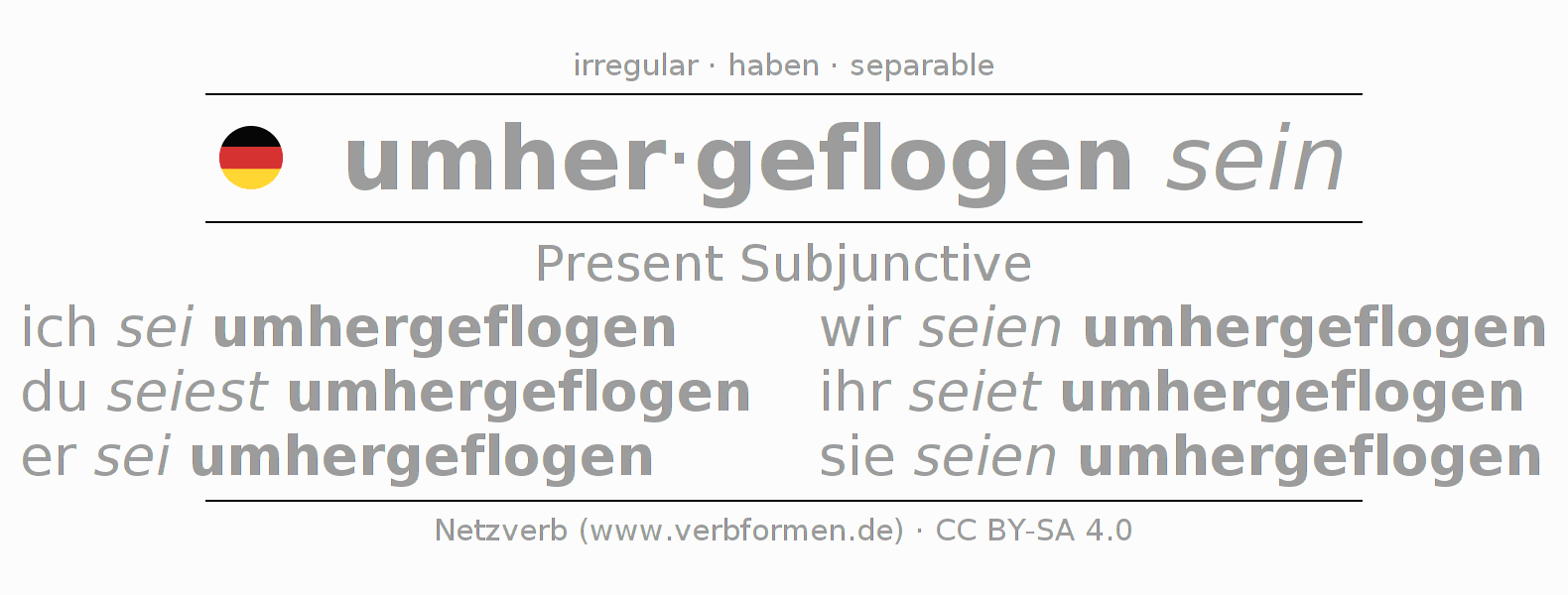 The verb umherfliegen (hat) fully conjugated in all persons and numbers in the Subjunctive Present