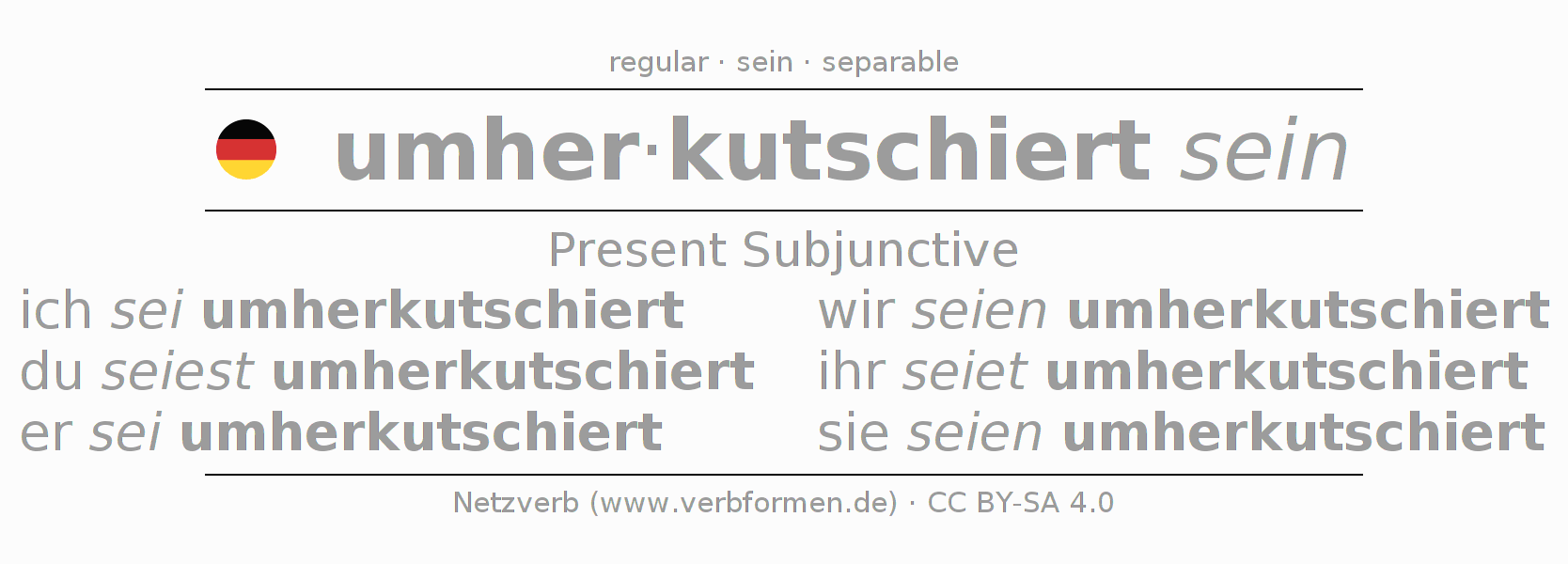 The conjugation of umherkutschieren in Subjunctive Present Form of possibility Statal Passive is ich sei umherkutschiert, du seiest umherkutschiert, er sei umherkutschiert, wir seien umherkutschiert, ihr seiet umherkutschiert, sie seien umherkutschiert.The conjugation corresponds to certain grammatical rules. Likewise the requirements for the conjugation of the simple verb forms of umherkutschieren in Present Subjunctive. Comments ☆
