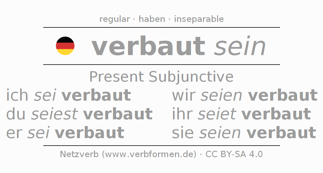The verb verbauen fully conjugated in all persons and numbers in the Subjunctive Present