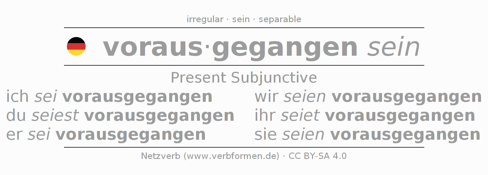 The verb vorausgehen fully conjugated in all persons and numbers in the Subjunctive Present