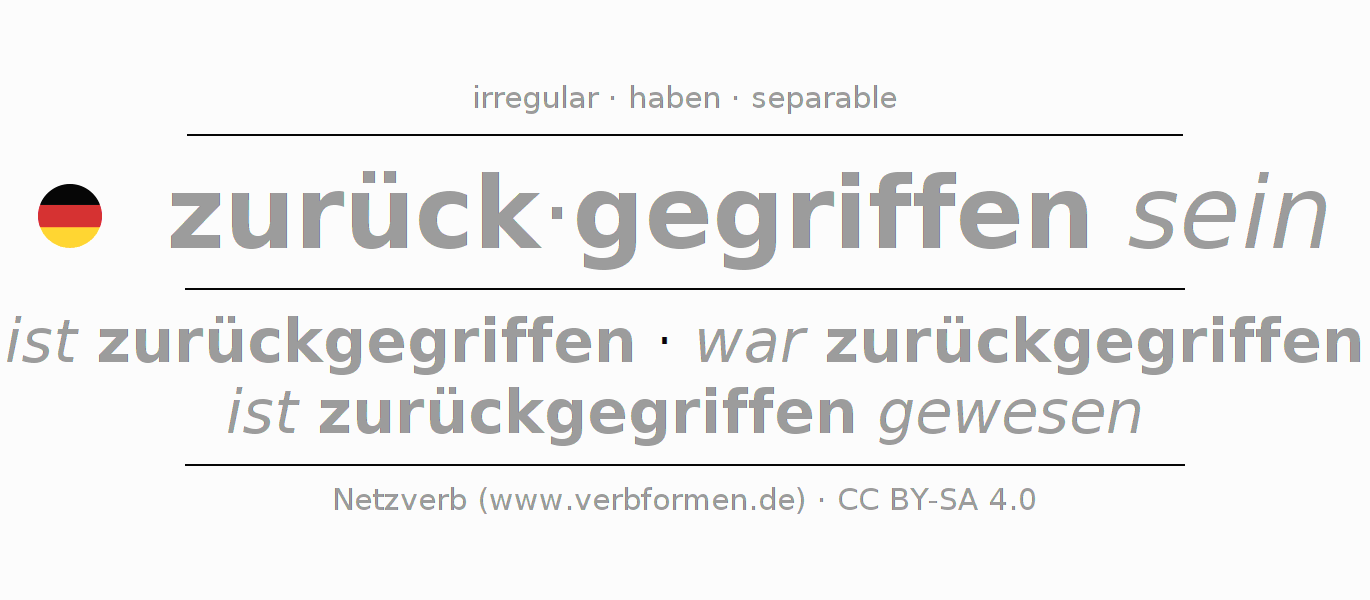 The conjugation of zurückgreifen in Subjunctive Present Form of possibility Statal Passive is ich sei zurückgegriffen, du seiest zurückgegriffen, er sei zurückgegriffen, wir seien zurückgegriffen, ihr seiet zurückgegriffen, sie seien zurückgegriffen.The conjugation corresponds to certain grammatical rules. Likewise the requirements for the conjugation of the simple verb forms of zurückgreifen in Present Subjunctive. Comments ☆