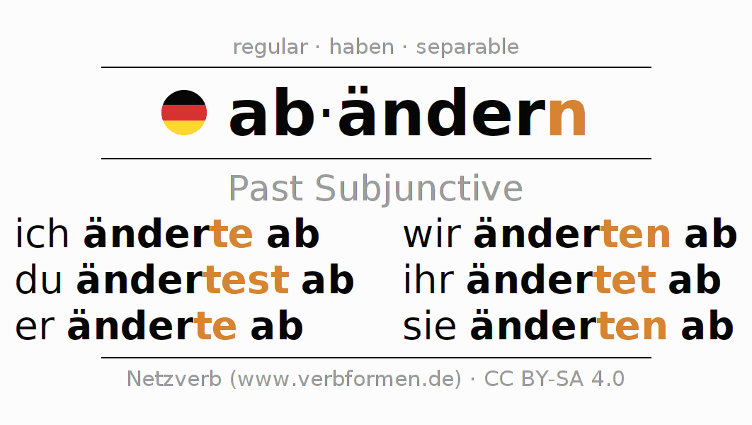 The conjugation of abändern (alter, modify) in subjunctive II is: ich änderte ab, du ändertest ab, er änderte ab, wir änderten ab, ihr ändertet ab, sie änderten ab. As a regular verb the unmodified stem änder is used. The subjunctive endings -te, -test, -te, -ten, -tet, -ten are appended to this stem. The prefix ab- of abändern is separated. The conjugation of these forms conforms to the grammatical rules for verbs in the subjunctive II tense.