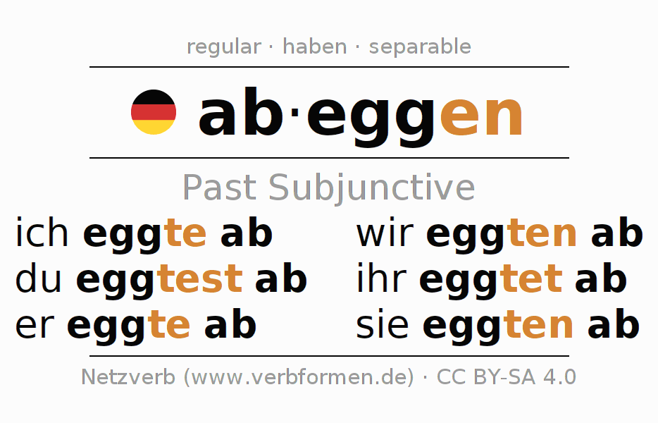 The conjugation of abeggen (harrow) in subjunctive II is: ich eggte ab, du eggtest ab, er eggte ab, wir eggten ab, ihr eggtet ab, sie eggten ab. As a regular verb the unmodified stem egg is used. The subjunctive endings -te, -test, -te, -ten, -tet, -ten are appended to this stem. The prefix ab- of abeggen is separated. The conjugation of these forms conforms to the grammatical rules for verbs in the subjunctive II tense.