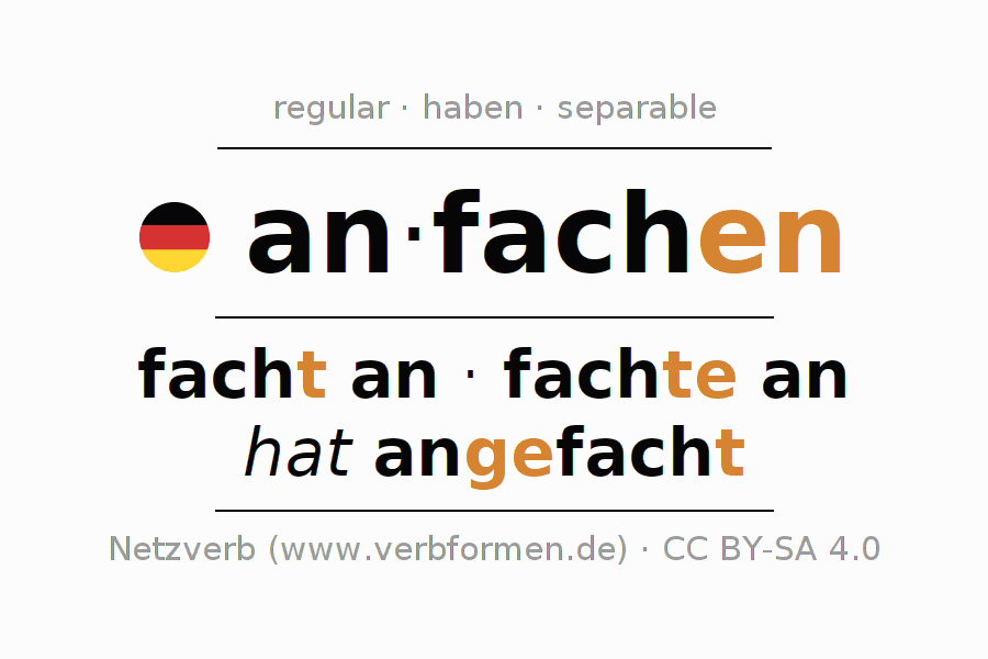 The conjugation of anfachen (kindle, amplify) in subjunctive II is: ich fachte an, du fachtest an, er fachte an, wir fachten an, ihr fachtet an, sie fachten an. As a regular verb the unmodified stem fach is used. The subjunctive endings -te, -test, -te, -ten, -tet, -ten are appended to this stem. The prefix an- of anfachen is separated. The conjugation of these forms conforms to the grammatical rules for verbs in the subjunctive II tense.