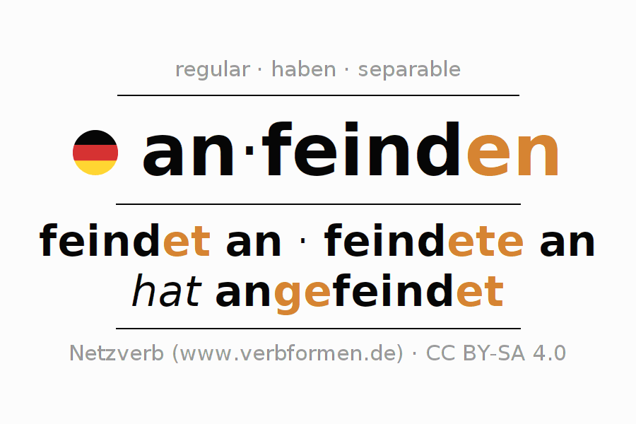 The conjugation of anfeinden (attack, be hostile (to)) in subjunctive II is: ich feindete an, du feindetest an, er feindete an, wir feindeten an, ihr feindetet an, sie feindeten an. As a regular verb the unmodified stem feind is used. The subjunctive endings -ete, -etest, -ete, -eten, -etet, -eten are appended to this stem. The endings are extended by "e", as the stem ends on -d. The prefix an- of anfeinden is separated. The conjugation of these forms conforms to the grammatical rules for verbs in the subjunctive II tense.
