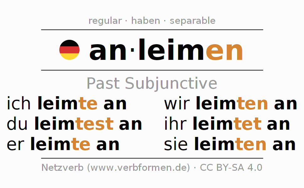 The conjugation of anleimen (bond, glue) in subjunctive II is: ich leimte an, du leimtest an, er leimte an, wir leimten an, ihr leimtet an, sie leimten an. As a regular verb the unmodified stem leim is used. The subjunctive endings -te, -test, -te, -ten, -tet, -ten are appended to this stem. The prefix an- of anleimen is separated. The conjugation of these forms conforms to the grammatical rules for verbs in the subjunctive II tense.