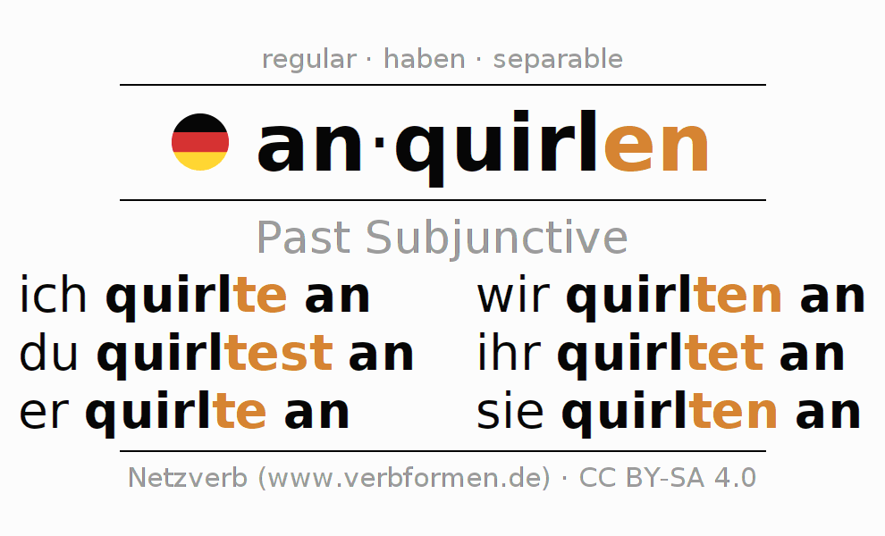 The conjugation of anquirlen (whisk) in subjunctive II is: ich quirlte an, du quirltest an, er quirlte an, wir quirlten an, ihr quirltet an, sie quirlten an. As a regular verb the unmodified stem quirl is used. The subjunctive endings -te, -test, -te, -ten, -tet, -ten are appended to this stem. The prefix an- of anquirlen is separated. The conjugation of these forms conforms to the grammatical rules for verbs in the subjunctive II tense.