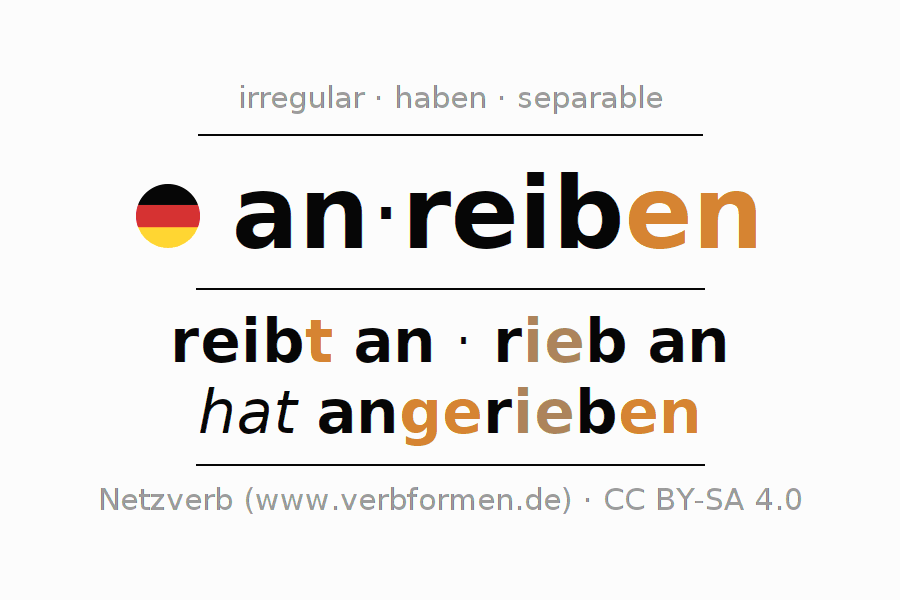 The conjugation of anreiben (abrade, grind) in subjunctive II is: ich riebe an, du riebest an, er riebe an, wir rieben an, ihr riebet an, sie rieben an. As an irregular, strong verb with ablaut -ie- the subjunctive stem -rieb- is used. The subjunctive endings -e, -est, -e, -en, -et, -en are appended to this stem. The prefix an- of anreiben is separated. The conjugation of these forms conforms to the grammatical rules for verbs in the subjunctive II tense.