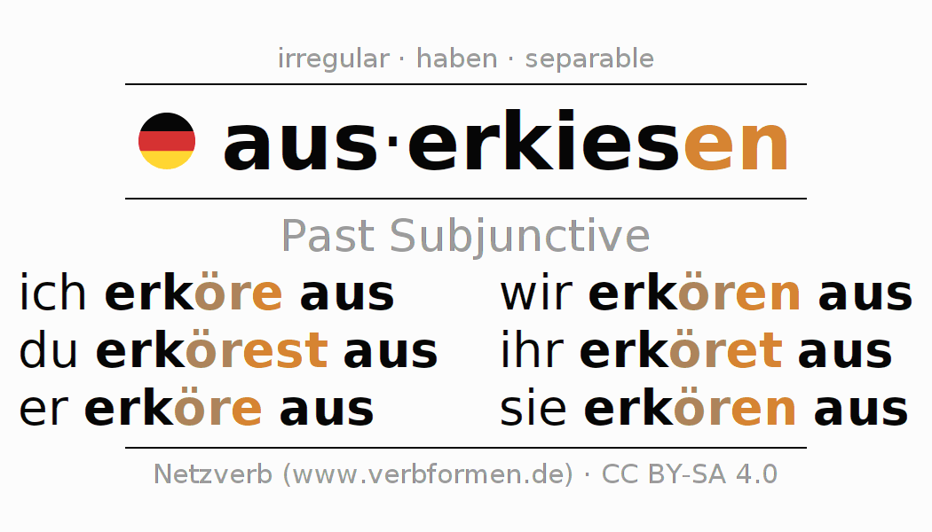 The conjugation of auserkiesen (choose, choose (for)) in subjunctive II is: ich erköre aus, du erkörest aus, er erköre aus, wir erkören aus, ihr erköret aus, sie erkören aus. As an irregular, strong verb with ablaut -ö- the subjunctive stem -kör- is used. The subjunctive endings -e, -est, -e, -en, -et, -en are appended to this stem. The prefix aus- of auserkiesen is separated. The conjugation of these forms conforms to the grammatical rules for verbs in the subjunctive II tense.
