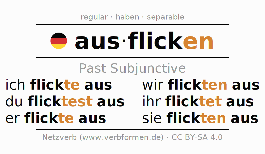 The conjugation of ausflicken (mend, patch) in subjunctive II is: ich flickte aus, du flicktest aus, er flickte aus, wir flickten aus, ihr flicktet aus, sie flickten aus. As a regular verb the unmodified stem flick is used. The subjunctive endings -te, -test, -te, -ten, -tet, -ten are appended to this stem. The prefix aus- of ausflicken is separated. The conjugation of these forms conforms to the grammatical rules for verbs in the subjunctive II tense.