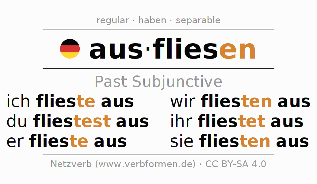 The conjugation of ausfliesen (tile) in subjunctive II is: ich flieste aus, du fliestest aus, er flieste aus, wir fliesten aus, ihr fliestet aus, sie fliesten aus. As a regular verb the unmodified stem flies is used. The subjunctive endings -te, -test, -te, -ten, -tet, -ten are appended to this stem. The prefix aus- of ausfliesen is separated. The conjugation of these forms conforms to the grammatical rules for verbs in the subjunctive II tense.