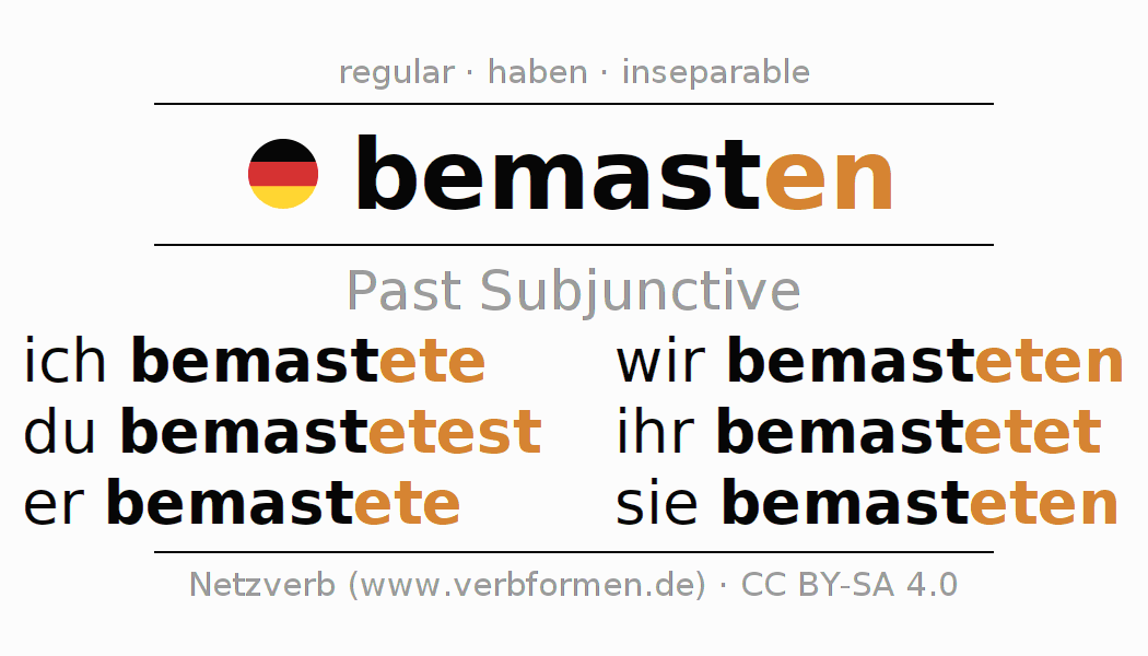 The conjugation of bemasten (masting) in subjunctive II is: ich bemastete, du bemastetest, er bemastete, wir bemasteten, ihr bemastetet, sie bemasteten. As a regular verb the unmodified stem mast is used. The subjunctive endings -ete, -etest, -ete, -eten, -etet, -eten are appended to this stem. The endings are extended by "e", as the stem ends on -t. The conjugation of these forms conforms to the grammatical rules for verbs in the subjunctive II tense.