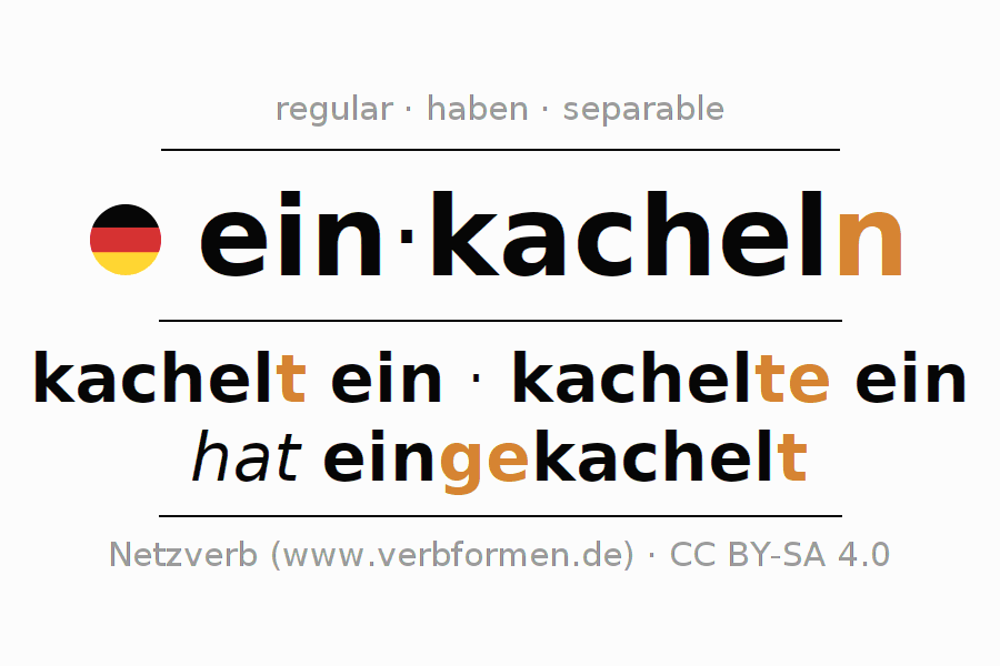 The conjugation of einkacheln (tile stove heating, tiled heating) in subjunctive II is: ich kachelte ein, du kacheltest ein, er kachelte ein, wir kachelten ein, ihr kacheltet ein, sie kachelten ein. As a regular verb the unmodified stem kachel is used. The subjunctive endings -te, -test, -te, -ten, -tet, -ten are appended to this stem. The prefix ein- of einkacheln is separated. The conjugation of these forms conforms to the grammatical rules for verbs in the subjunctive II tense.