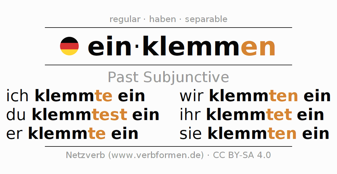The conjugation of einklemmen (clamp, jam) in subjunctive II is: ich klemmte ein, du klemmtest ein, er klemmte ein, wir klemmten ein, ihr klemmtet ein, sie klemmten ein. As a regular verb the unmodified stem klemm is used. The subjunctive endings -te, -test, -te, -ten, -tet, -ten are appended to this stem. The prefix ein- of einklemmen is separated. The conjugation of these forms conforms to the grammatical rules for verbs in the subjunctive II tense.
