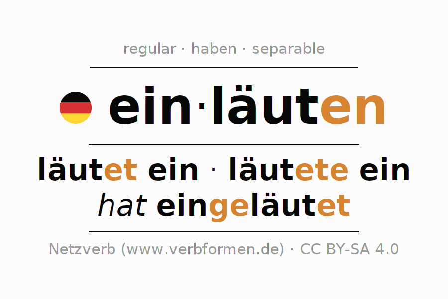 The conjugation of einläuten (herald, ring in) in subjunctive II is: ich läutete ein, du läutetest ein, er läutete ein, wir läuteten ein, ihr läutetet ein, sie läuteten ein. As a regular verb the unmodified stem läut is used. The subjunctive endings -ete, -etest, -ete, -eten, -etet, -eten are appended to this stem. The endings are extended by "e", as the stem ends on -t. The prefix ein- of einläuten is separated. The conjugation of these forms conforms to the grammatical rules for verbs in the subjunctive II tense.