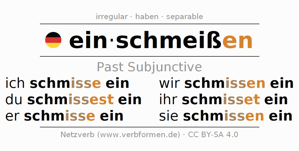 The verb einschmeißen fully conjugated in all persons and numbers in the Subjunctive Imperfect