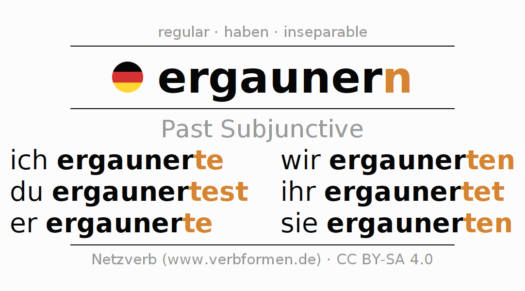 The conjugation of ergaunern (grift, cheat) in subjunctive II is: ich ergaunerte, du ergaunertest, er ergaunerte, wir ergaunerten, ihr ergaunertet, sie ergaunerten. As a regular verb the unmodified stem gauner is used. The subjunctive endings -te, -test, -te, -ten, -tet, -ten are appended to this stem. The conjugation of these forms conforms to the grammatical rules for verbs in the subjunctive II tense.