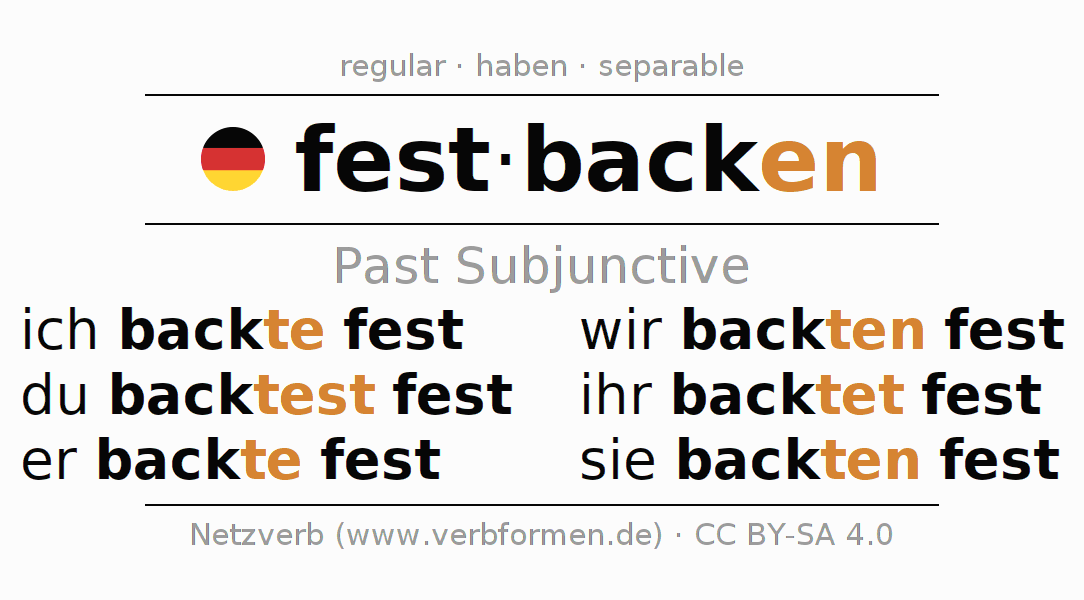The conjugation of festbacken (cake, adhere) in subjunctive II is: ich backte fest, du backtest fest, er backte fest, wir backten fest, ihr backtet fest, sie backten fest. As a regular verb the unmodified stem back is used. The subjunctive endings -te, -test, -te, -ten, -tet, -ten are appended to this stem. The prefix fest- of festbacken is separated. The conjugation of these forms conforms to the grammatical rules for verbs in the subjunctive II tense.
