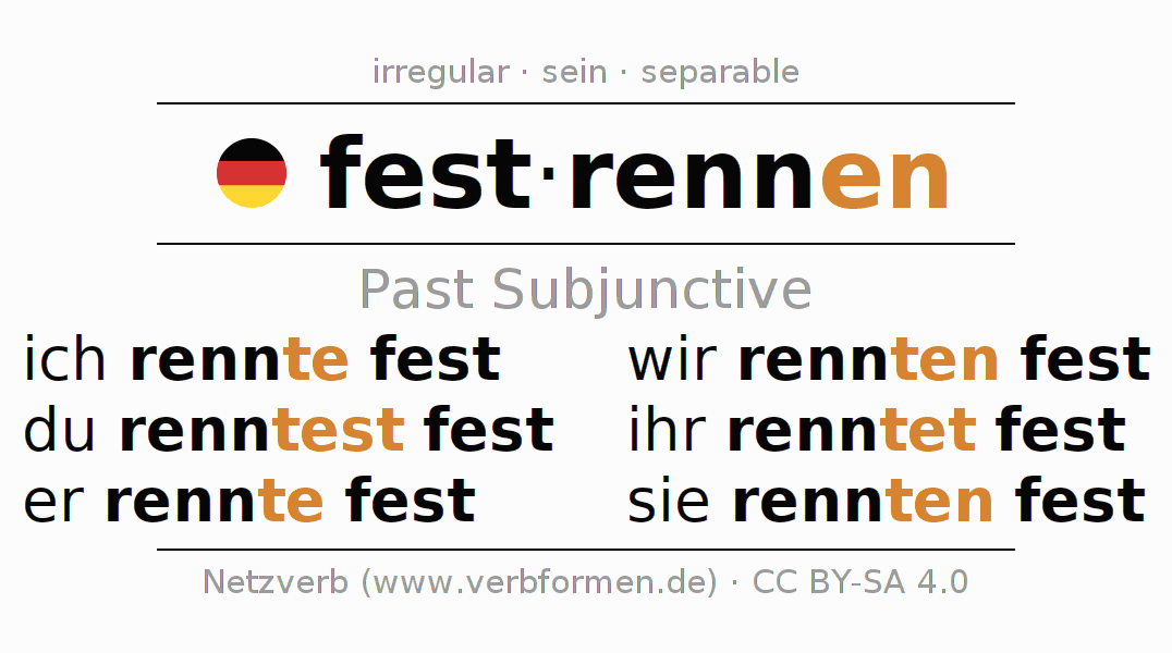The conjugation of festrennen in subjunctive II is: ich rennte fest, du renntest fest, er rennte fest, wir rennten fest, ihr renntet fest, sie rennten fest. As an irregular verb is the changed subjunctive stem renn- used. The subjunctive endings -te, -test, -te, -ten, -tet, -ten are appended to this stem. The prefix fest- of festrennen is separated. The conjugation of these forms conforms to the grammatical rules for verbs in the subjunctive II tense.