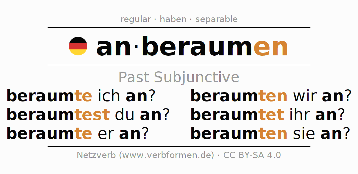 The conjugation of anberaumen in Subjunctive Imperfect Form of possibility Active is beraumte ich an?, beraumtest du an?, beraumte er an?, beraumten wir an?, beraumtet ihr an?, beraumten sie an?.The conjugation corresponds to certain grammatical rules. Likewise the requirements for the conjugation of the simple verb forms of anberaumen in Imperfect Subjunctive. Comments ☆