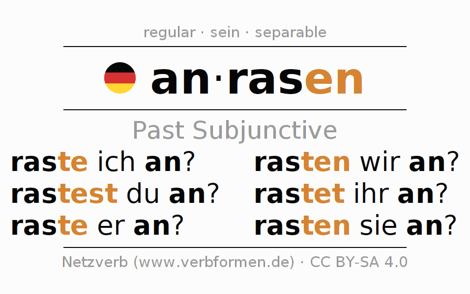 The conjugation of anrasen in Subjunctive Imperfect Form of possibility Active is raste ich an?, rastest du an?, raste er an?, rasten wir an?, rastet ihr an?, rasten sie an?.The conjugation corresponds to certain grammatical rules. Likewise the requirements for the conjugation of the simple verb forms of anrasen in Imperfect Subjunctive. Comments ☆