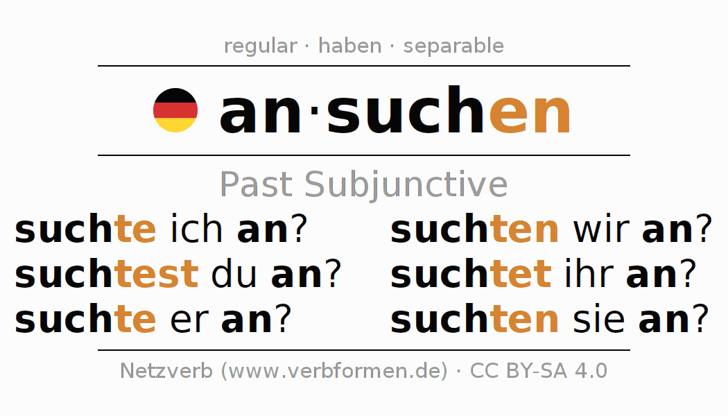 The conjugation of ansuchen in Subjunctive Imperfect Form of possibility Active is suchte ich an?, suchtest du an?, suchte er an?, suchten wir an?, suchtet ihr an?, suchten sie an?.The conjugation corresponds to certain grammatical rules. Likewise the requirements for the conjugation of the simple verb forms of ansuchen in Imperfect Subjunctive. Comments ☆