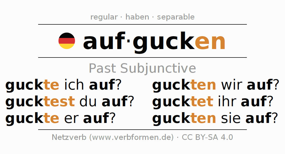 The conjugation of aufgucken in Subjunctive Imperfect Form of possibility Active is guckte ich auf?, gucktest du auf?, guckte er auf?, guckten wir auf?, gucktet ihr auf?, guckten sie auf?.The conjugation corresponds to certain grammatical rules. Likewise the requirements for the conjugation of the simple verb forms of aufgucken in Imperfect Subjunctive. Comments ☆