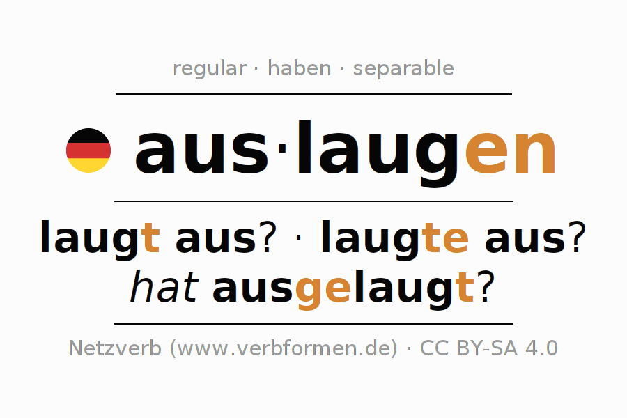 The conjugation of auslaugen in Subjunctive Imperfect Form of possibility Active is laugte ich aus?, laugtest du aus?, laugte er aus?, laugten wir aus?, laugtet ihr aus?, laugten sie aus?.The conjugation corresponds to certain grammatical rules. Likewise the requirements for the conjugation of the simple verb forms of auslaugen in Imperfect Subjunctive. Comments ☆