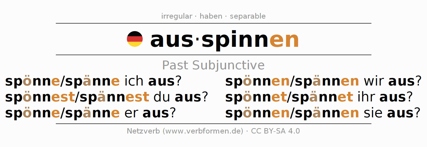 The conjugation of ausspinnen in Subjunctive Imperfect Form of possibility Active is spönne/spänne ich aus?, spönnest/spännest du aus?, spönne/spänne er aus?, spönnen/spännen wir aus?, spönnet/spännet ihr aus?, spönnen/spännen sie aus?.The conjugation corresponds to certain grammatical rules. Likewise the requirements for the conjugation of the simple verb forms of ausspinnen in Imperfect Subjunctive. Comments ☆