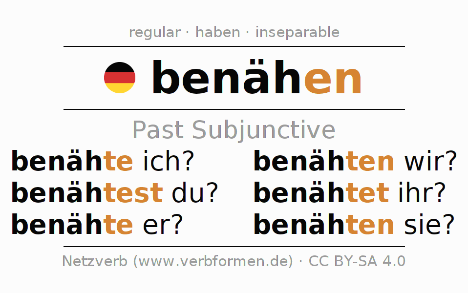 The conjugation of benähen in Subjunctive Imperfect Form of possibility Active is benähte ich?, benähtest du?, benähte er?, benähten wir?, benähtet ihr?, benähten sie?.The conjugation corresponds to certain grammatical rules. Likewise the requirements for the conjugation of the simple verb forms of benähen in Imperfect Subjunctive. Comments ☆