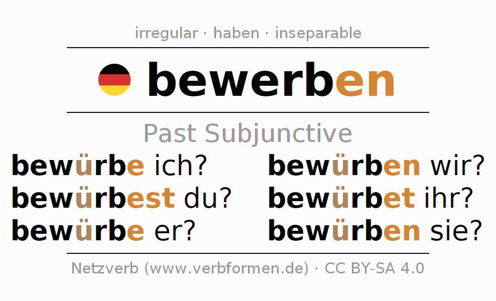 The conjugation of bewerben in Subjunctive Imperfect Form of possibility Active is bewürbe ich?, bewürbest du?, bewürbe er?, bewürben wir?, bewürbet ihr?, bewürben sie?.The conjugation corresponds to certain grammatical rules. Likewise the requirements for the conjugation of the simple verb forms of bewerben in Imperfect Subjunctive. Comments ☆