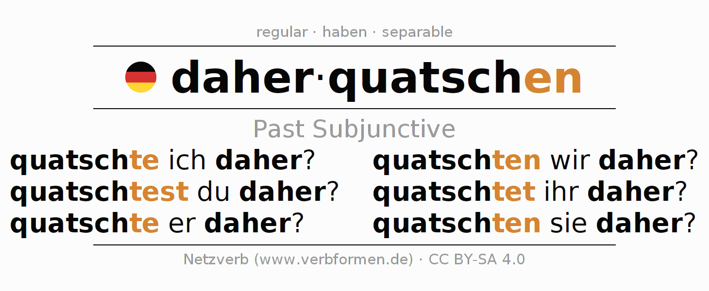 The conjugation of daherquatschen in Subjunctive Imperfect Form of possibility Active is quatschte ich daher?, quatschtest du daher?, quatschte er daher?, quatschten wir daher?, quatschtet ihr daher?, quatschten sie daher?.The conjugation corresponds to certain grammatical rules. Likewise the requirements for the conjugation of the simple verb forms of daherquatschen in Imperfect Subjunctive. Comments ☆