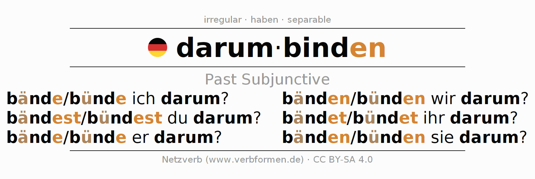 The conjugation of darumbinden in Subjunctive Imperfect Form of possibility Active is bände/bünde ich darum?, bändest/bündest du darum?, bände/bünde er darum?, bänden/bünden wir darum?, bändet/bündet ihr darum?, bänden/bünden sie darum?.The conjugation corresponds to certain grammatical rules. Likewise the requirements for the conjugation of the simple verb forms of darumbinden in Imperfect Subjunctive. Comments ☆