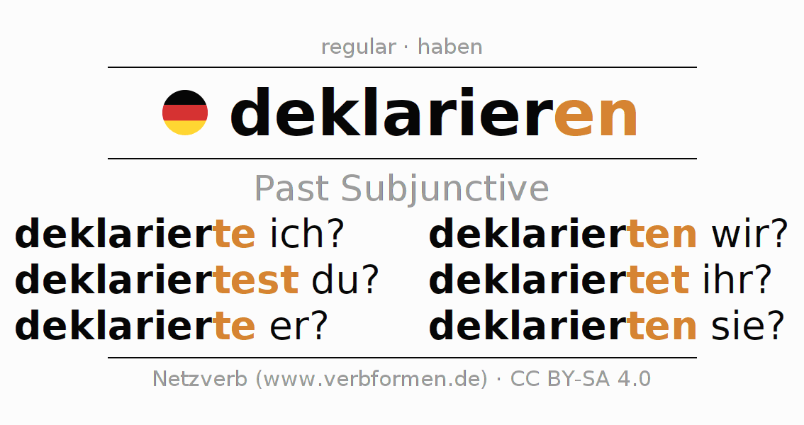 The conjugation of deklarieren in Subjunctive Imperfect Form of possibility Active is deklarierte ich?, deklariertest du?, deklarierte er?, deklarierten wir?, deklariertet ihr?, deklarierten sie?.The conjugation corresponds to certain grammatical rules. Likewise the requirements for the conjugation of the simple verb forms of deklarieren in Imperfect Subjunctive. Comments ☆