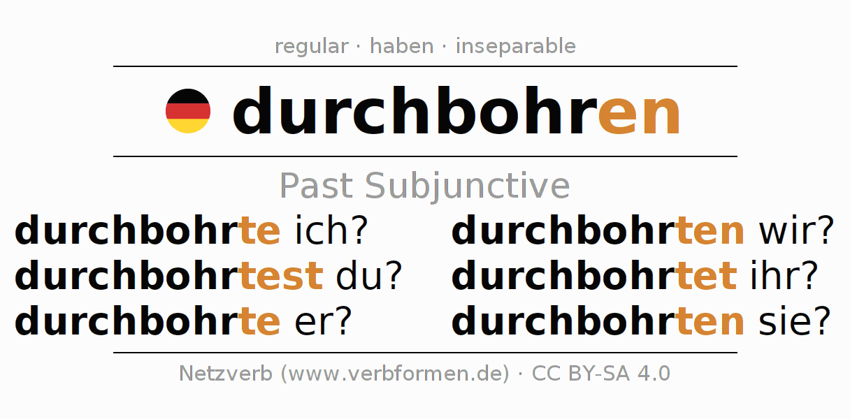 The conjugation of durchbohren in Subjunctive Imperfect Form of possibility Active is durchbohrte ich?, durchbohrtest du?, durchbohrte er?, durchbohrten wir?, durchbohrtet ihr?, durchbohrten sie?.The conjugation corresponds to certain grammatical rules. Likewise the requirements for the conjugation of the simple verb forms of durchbohren in Imperfect Subjunctive. Comments ☆